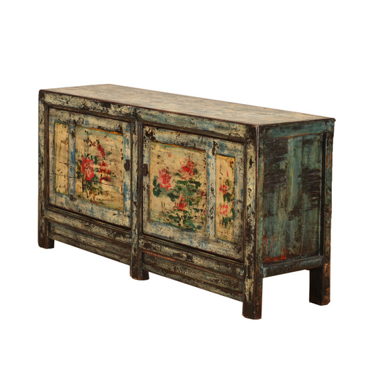 Vintage Chinese Crackle Blue Sideboard with floral painting 01