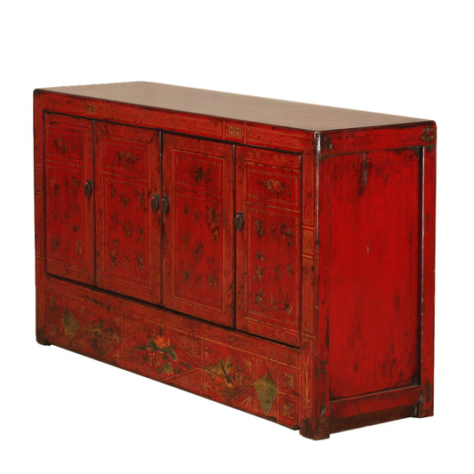 Vintage Chinese Hand Painted Red Dongbei Sideboard