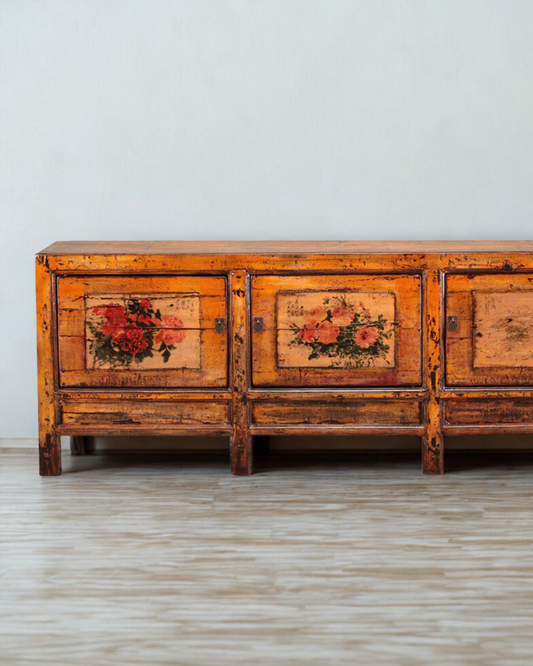 Vintage Chinese Hand Painted Orange Sideboard with Flowers