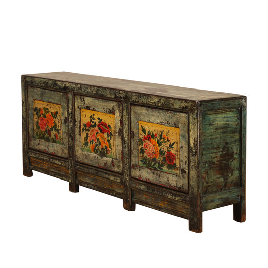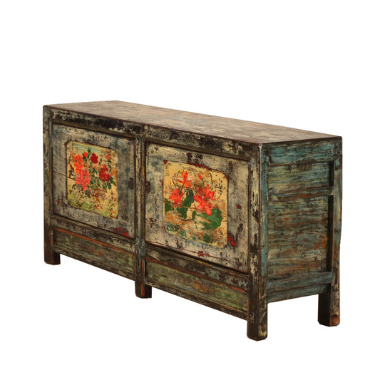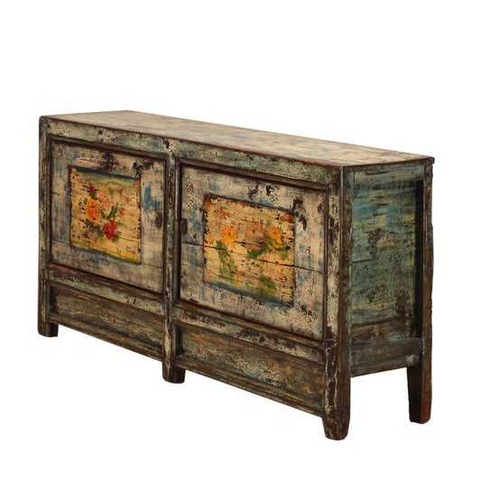 Vintage Chinese Crackle Blue Sideboard with floral painting 04