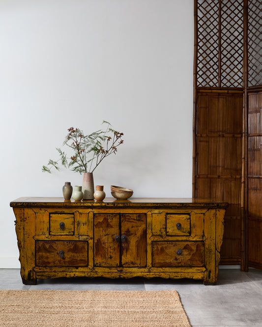 Vintage Chinese Yellow Low Cabinet from Gansu