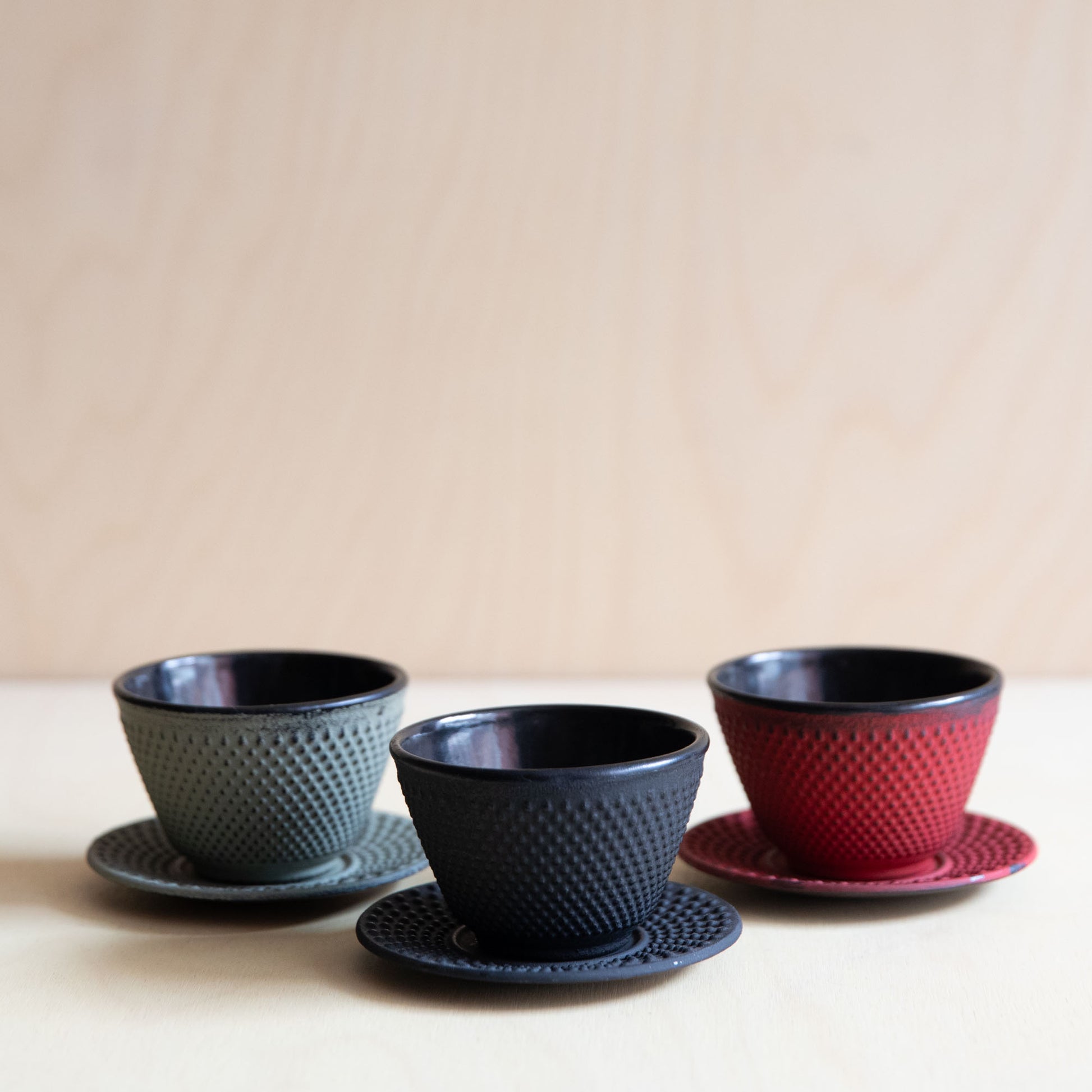 This Japanese cast iron tea cup and saucer set has a textured red exterior and a black gloss enameled inside.