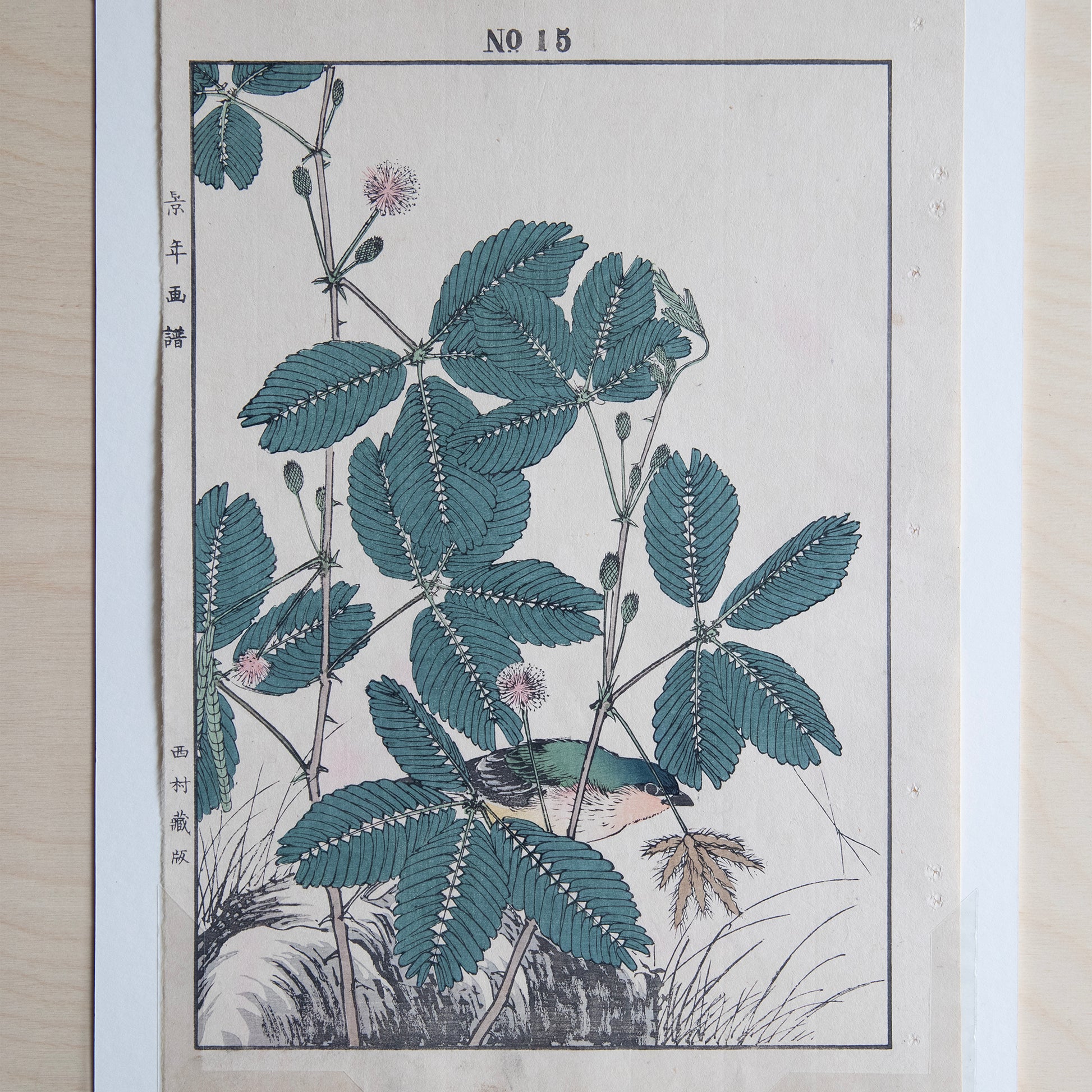 This original print features the very sweet scene of an Oliver Sparrow peeking from beneath a shameplant ( known for its recoiling leaves). This piece was created by a number of artisans using a series of hand-carved wooden blocks, carefully printed in layers.