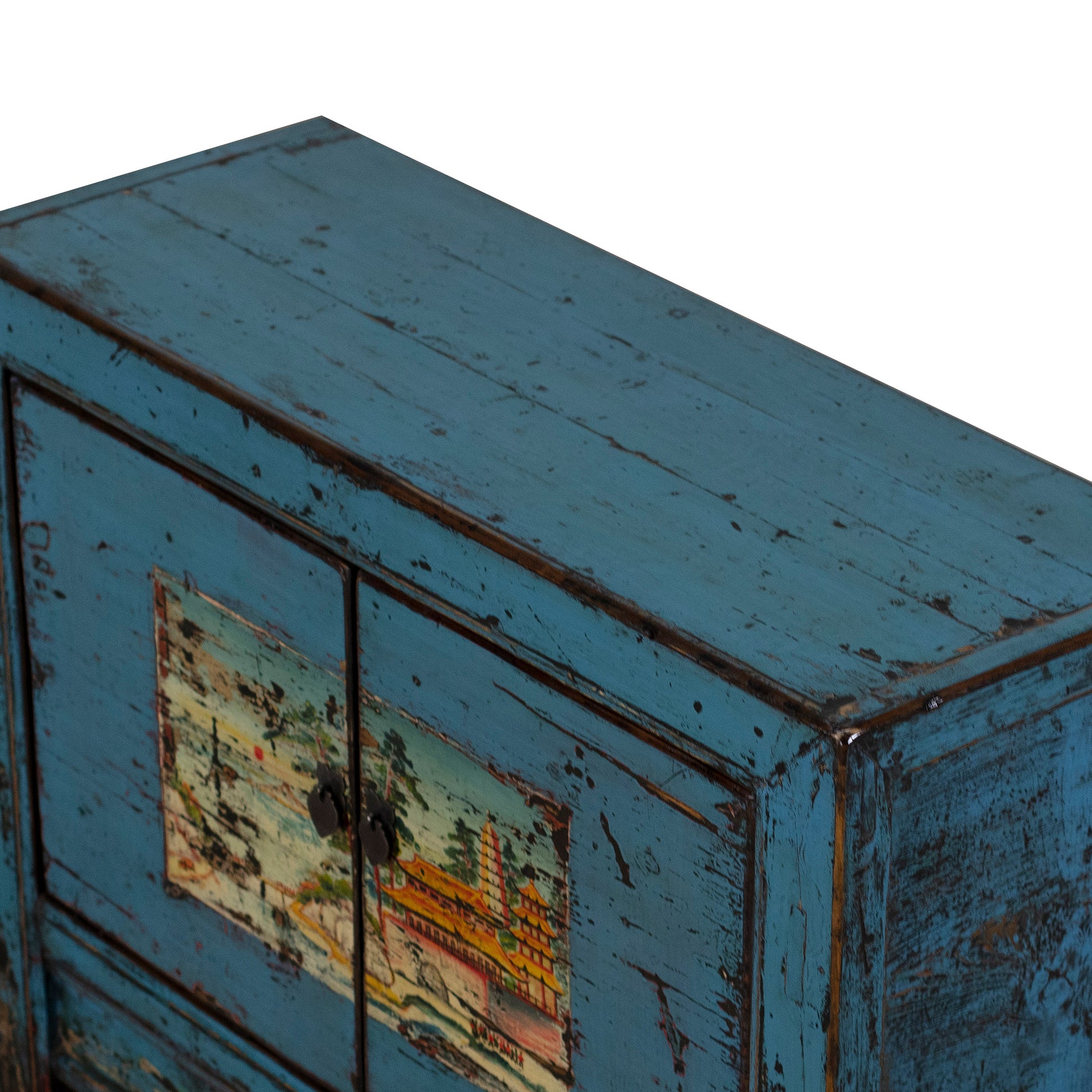 Painted in a striking dark turquoise with a distressed overlay. The piece has a magical central scene across the doors featuring a traditional Chinese pagoda and lake. To the front apron of the cabinet small decorative inlays have been carved.
